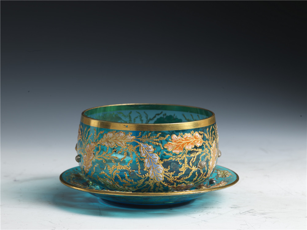 透明天蓝色镀金玻璃画珐琅花卉纹碗碟