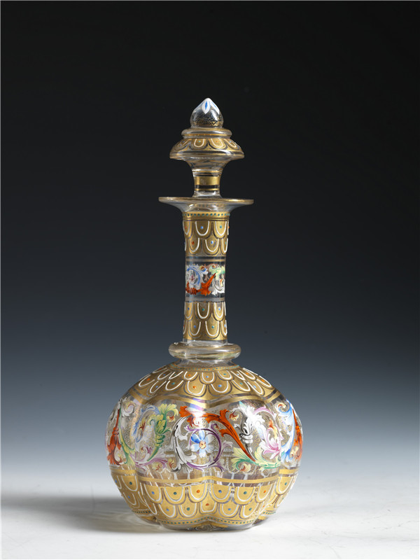 此次展览共展示王桐发、梁世平伉俪捐赠西洋玻璃珐琅器70件套,藏品时代跨度二百余年,地域跨欧美西亚,其中不乏名品佳作,一定程度展示了西洋玻璃珐琅器的制作工艺特点及水平。展览以藏品的工艺特征为主线,由五个部分组成,分别是金碧辉煌——镀金银玻璃、银华映彩——画珐琅玻璃、方诸流映——镀金、描金与画珐琅玻璃、彩焕璇杓——套料车刻玻璃及琪花吐艳——特殊工艺玻璃。展览将突出向观众呈现玻璃器的工艺特点及地域特色。