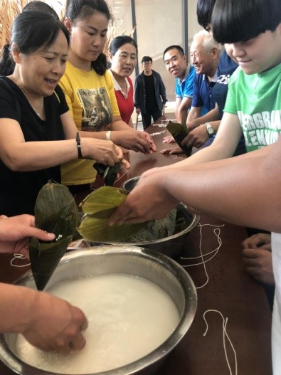 在制作香囊的活动中,因步骤复杂,大家非常仔细,认真完成每一个环节,一件件出色的作品充分的展现了孩子们的动手能力。包粽子活动勾起了大家的兴趣,每个孩子都积极的参与进来,体验劳作的快乐。画龙舟活动环节可是孩子们自由发挥的欢乐时刻。每个孩子都选择了一件自己最喜爱的天津博物馆藏品画在画卷上,玉壶春瓶、太保鼎、荷花纹盘、匏制葫芦瓶在他们的画笔下惟妙惟肖,在他们的带动下,现场观众也都纷纷参与其中。