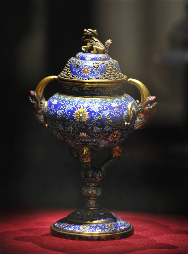 清 掐丝珐琅宝相花纹狮钮高足炉
