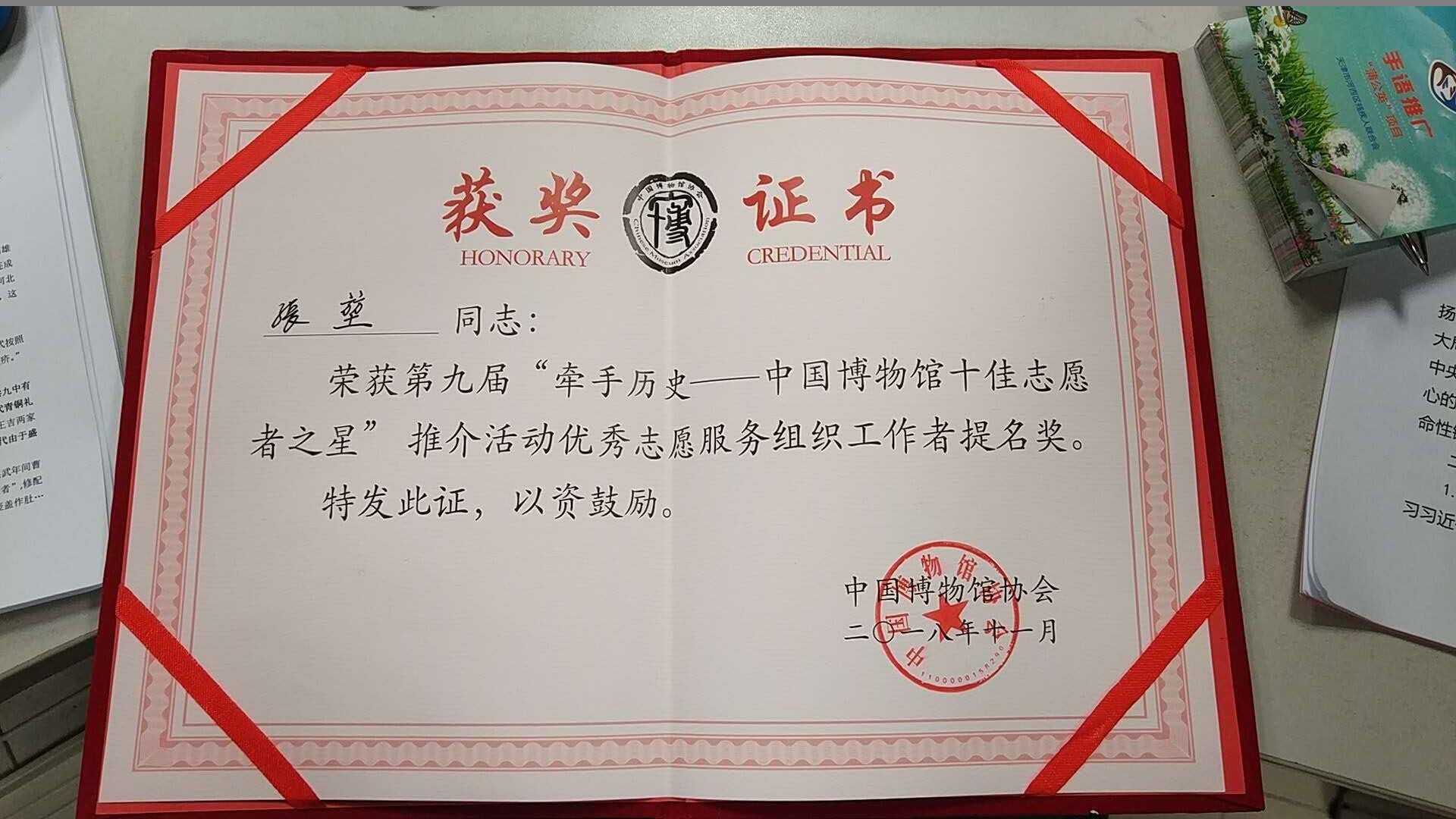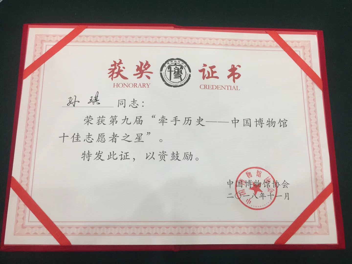 志愿者孙琪荣获“牵手历史——中国博物馆十佳志愿者之星”奖