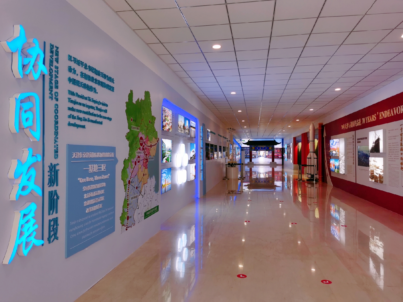 展览分为牢记嘱托砥砺前行、协同发展新阶段、高质量发展新篇章、全面开放新格局、津沽大地新画卷五个部分。活力天津,沿着习近平总书记指引的方向,踏上新时代新征程。全国先进制造研发基地、北方国际航运核心区、金融创新运营示范区、改革开放先行区──作为京津冀城市群中心城市之一,天津积极承接北京非首都功能疏解,建成滨海—中关村科技园等一批承接载体和平台,2014年至2018年北京企业在津投资到位额超6400亿元。