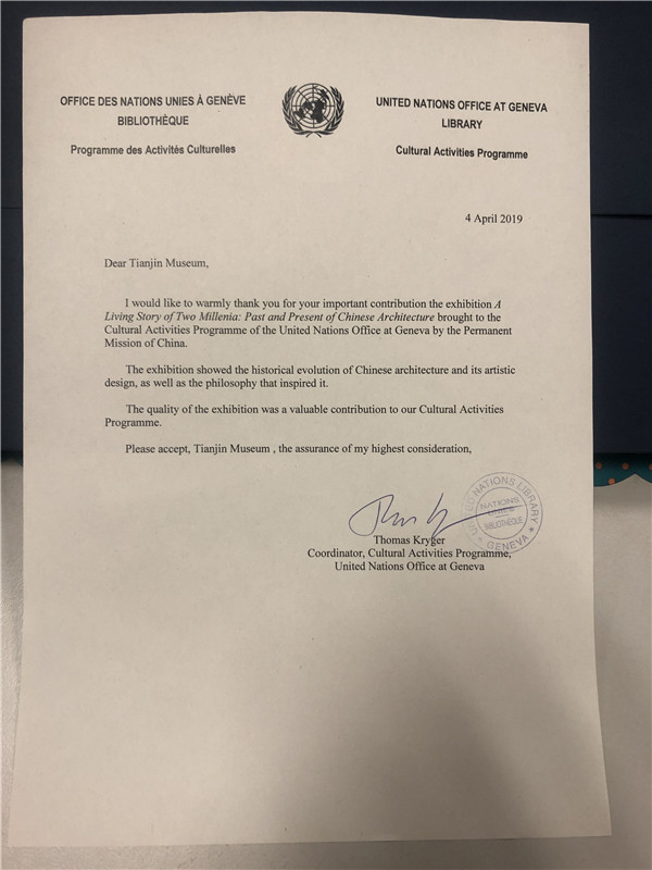 联合国日内瓦办事处文化活动方对天津博物馆文创产品的展出活动给予了肯定。会上,天津美术学院副院长郭振山教授向我馆副馆长王昆转交了联合国日内瓦办事处文化活动方托马斯签署的感谢函,感谢天津博物馆对此次展览做出的重要贡献。