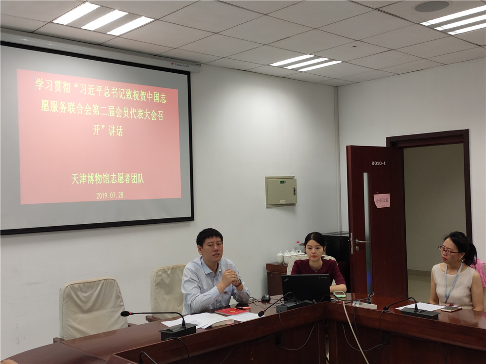 宣教部党支部书记张堃首先宣读“习近平总书记致中国志愿者服务联合会第二届会员代表大会贺信”的重要精神,对习近平总书记对文博工作的重要指示进行深入解读。同时,结合上半年天津博物馆志愿者工作实际,张堃同志对下半年志愿者团队开展庆祝新中国70周年工作事宜进行部署。