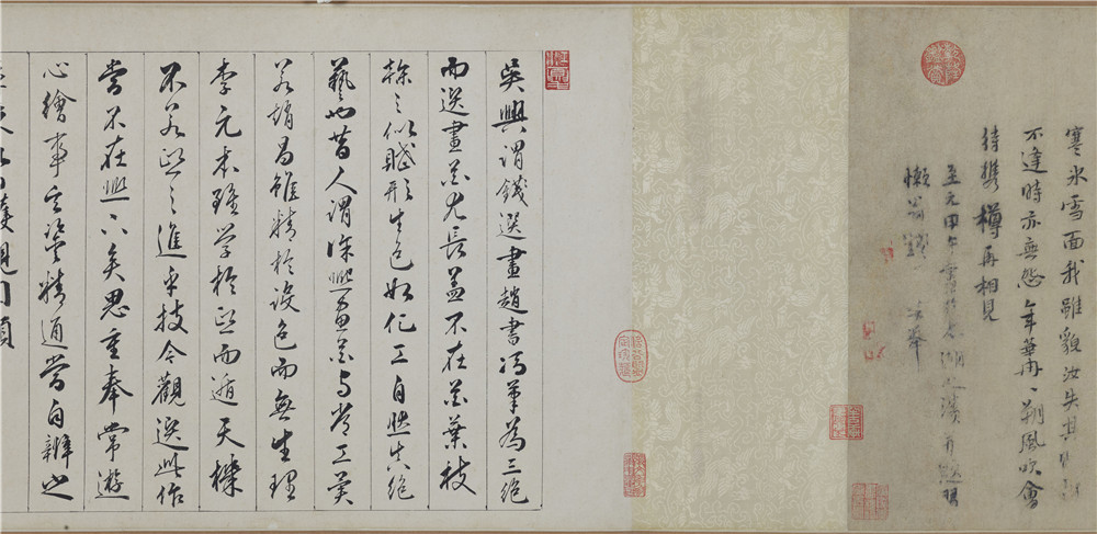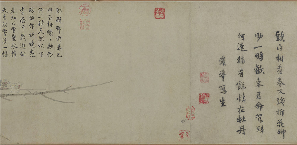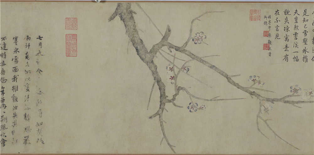 天津博物馆藏元代钱选《花鸟图卷》参加了此次展览,且是该展览唯一外借的展品。钱选是元代早期重要画家,工诗文,善书画,在山水、人物及花鸟画领域均取得了突出的成就。他的花鸟画擅于捕捉自然界花卉禽鸟最生动的情形,形态逼真而不失情趣。此件《花鸟图卷》分三段绘了桃花翠鸟、牡丹、梅花,每段画均配有作者自题诗一首。诗意与画意相辅相成,所绘形象准确,神态生动,笔力挺健,是钱选花鸟画至精之作。