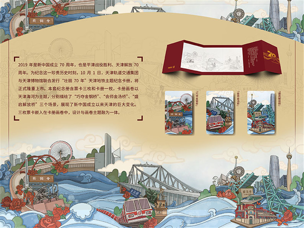 2019年是新中国成立70周年,也是平津战役胜利、天津解放70周年。为纪念这一珍贵历史时刻,天津博物馆与天津轨道交通集团首度跨界合作,联合发行“壮丽70年”天津地铁主题纪念卡册,10月1日起隆重发售。