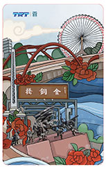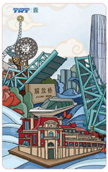 第三张票卡,以改革开放以来天津历史建筑变迁为线索,以开启的解放桥为代表,展现了天津城市面貌日新月异的变化。卡册主题画面背景设计巧妙的将海河作为依托,同时辅以天津市花“月季花”加以点缀,代表着天津人民对幸福、美好、和平、友谊的追求与向往。