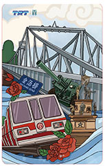 第一张票卡,展现的是平津战役胜利70周年,以“巧夺金钢桥”事件为主场景,将新老金钢桥置于同一画面,表现这座老桥由1903年的一座双叶承梁式钢架桥,历经战争摧残,至1996年全新改造为如今的“彩虹桥”的坎坷命运,革命战士群像雕塑再现了平津战役主战场的宏大场面,凸显平津战役胜利的伟大意义。