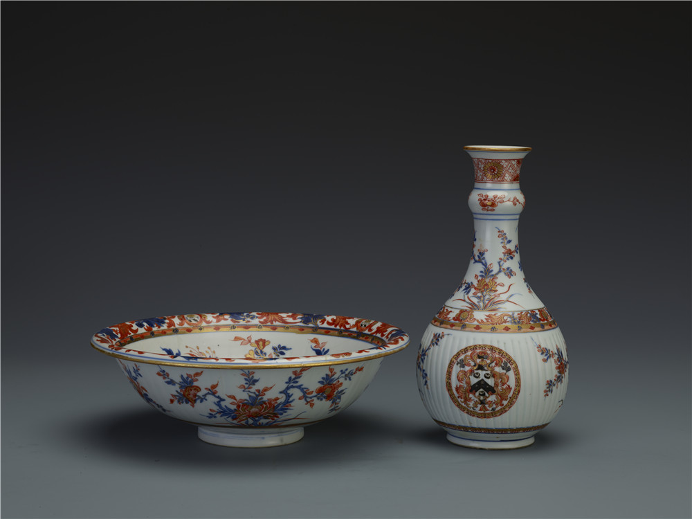 清康熙青花矾红描金沃克家族纹章纹洗手瓶、洗手盆