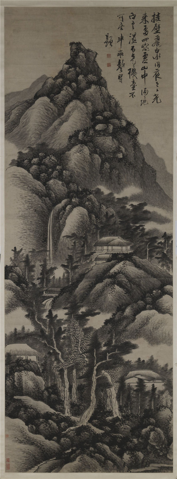 款署:“挂壁飞泉同夜月,月光来处四窗虚。山中满地白云湿,不是楼台不可居。半亩龚贤题。”