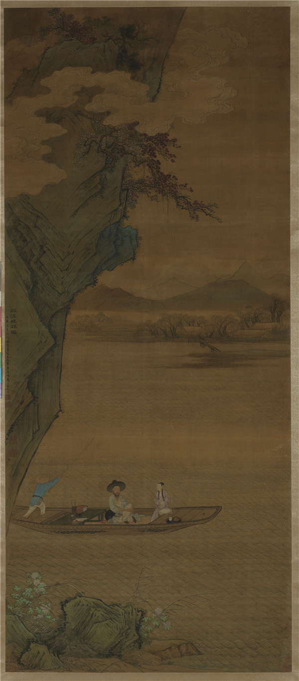 此图绘绝壁下一叶小舟泛波江上,舟上一美髯文士抱膝闲眺,右边一妇人手持折扇似正在击节唱曲,船工做撑船状,背对观众,构思巧妙,动态十足。江水微凌,近景处芦苇飘曳,不画风而知秋风习习,一派初秋景象,是禹之鼎晚年高士行乐图中的佳作。
