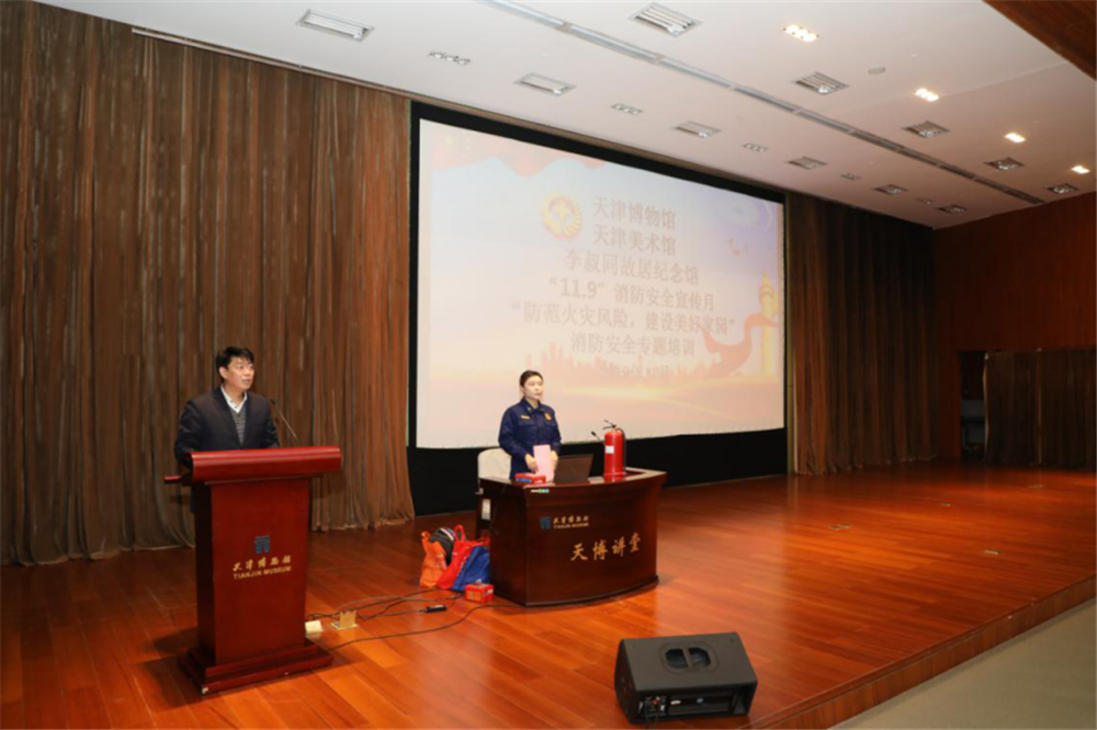2019年11月13日,天博开展了“11 .9”消防专题培训,天津博物馆、天津美术馆、李叔同纪念馆全体员工参加。公安消防河西支队宣教科谢科长就消防安全的重要性、消防“四个能力”、疏散逃生的基本常识以及消防器材的正确使用方法等方面的内容,对文博场馆如何树立公共安全消防意识,预防、杜绝可能引起消防隐患及个人面对突发火灾事故,如何进行救助和逃生等知识进行了全面讲解。通过培训,大家对防火自救的基本知识有了进一步的了解,更好地掌握了消防应急措施的运用和消防器材的使用方法,提高了我馆职工的消防安全意识、增强了应急处置能力。
