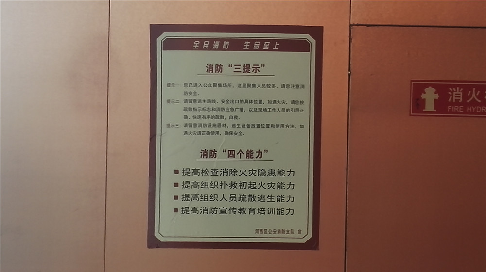 活动期间,我馆利用馆内电子屏、宣传栏、宣传展架等宣传工具,广泛开展消防安全宣传教育,使本馆职工和观众朋友们在工作和参观游览之余了解消防常识、学习消防知识、提高消防安全意识。全馆150余间办公室、设备间、功能部室全部张贴了消防知识宣传海报,包括了消防四个能力建设、消防安全三提示、消防三懂三会、办公室防火常识等消防知识。使馆内职工在办公室随时可以方便的看到学到消防知识,提高防火安全意识,尤其是在张贴海报后馆内职工能自觉遵守办公室消防规定如下班后断电,杜绝了使用大功率用电器、堆放易燃杂物等现象,取得了良好的效果。