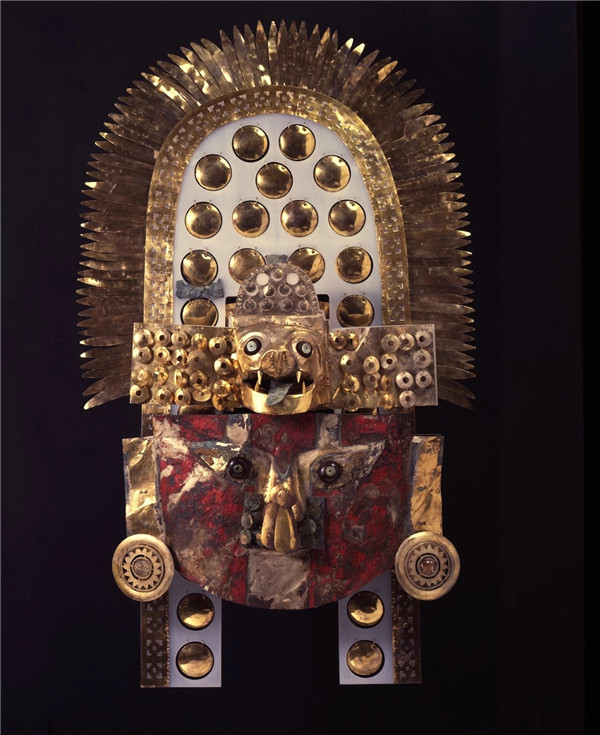 这是该头饰首次完整地走出秘鲁国境。该展品呈现了前西班牙时期黄金技艺的巅峰,蝙蝠头饰有转动的眼睛,每只都是由琥珀和绿松石穿孔的珠子制成。从两对尖牙之间伸出的长舌也可以从一侧移动到另一侧。在当时的年代,并不像如今有如此之多的灯光霓虹,屏幕闪烁,所以当普通群众看到有人身着金饰闪闪发光的出现时,会认为是神的降临。