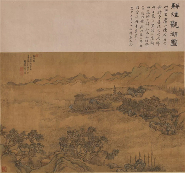 此图仿刘松年笔意绘潮水涛涛之状,远景楼阁树木掩映烟云之中,岸边巨石以石青点染,观之犹如身临其境。刘松年(生卒年不详)南宋画家,钱塘(今浙江省杭州)人。艺术活动主要在12世纪后半叶,毕生供职画院,善画山水、人物,其艺术水平被誉为“院人中绝品”,画史上与李唐、马远、夏珪并称为南宋四家。款署:“观潮图。庚寅十月望日,为大承道社长兄师松年笔,耕烟散人石谷王翚。”曾经两代帝师翁同龢鉴藏并于诗堂题跋。