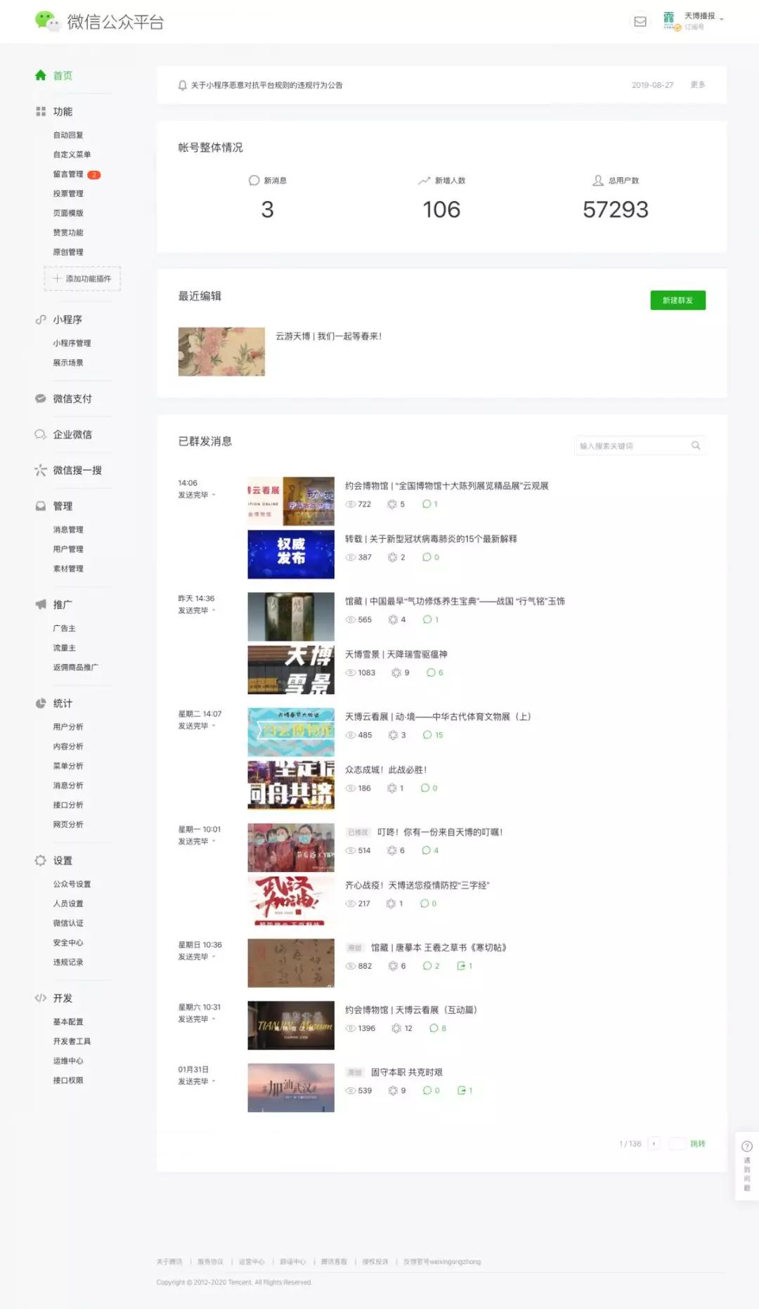 24号暂时闭馆以来,天津博物馆微博已推送博文200多篇,收获阅读量1200多万。网站、微信工作平台坚持每天更新,达到近50000阅读量,影响广泛。