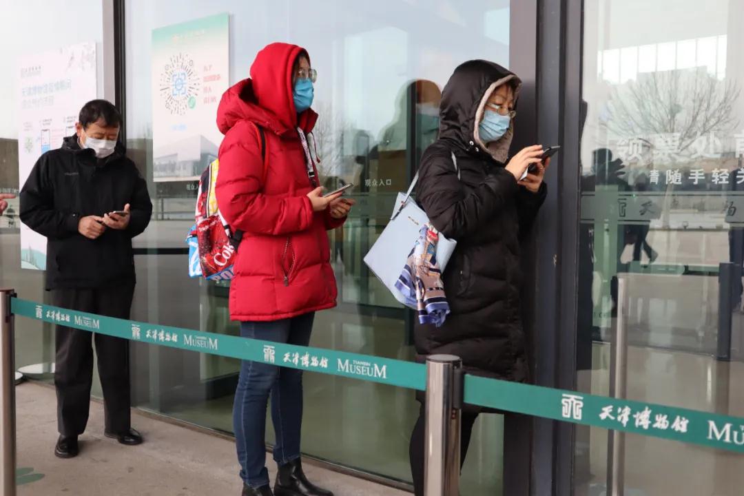 尽管当天气温骤降,天空还飘起蒙蒙小雨,但是观众参观热情依然高涨。在天津博物馆公布恢复开放消息的第一天,就有800余名观众成功预约,开馆一小时就有近200名观众入馆。