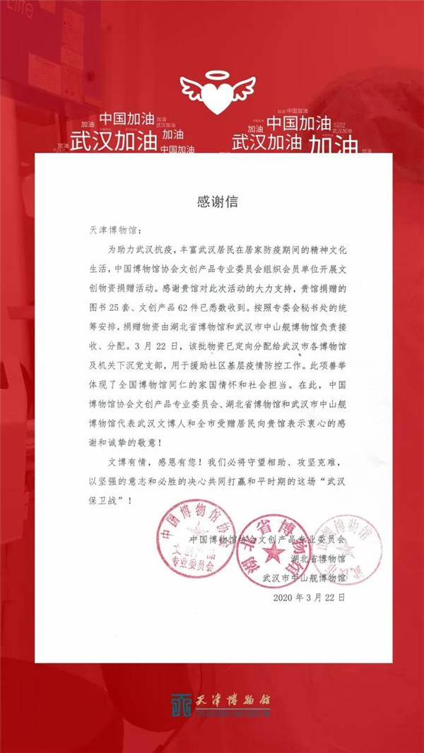 为助力武汉抗疫,丰富武汉居民在居家防疫期间的精神文化生活,天津博物馆、天津美术馆积极响应中国博物馆协会文创产品专业委员会组织的会员单位文创物资捐赠活动,用于援助社区基层疫情防控工作。此次捐赠的图书涉及历史、书画、文学艺术等领域,文创产品均带有浓浓的天津特色及文化内涵。