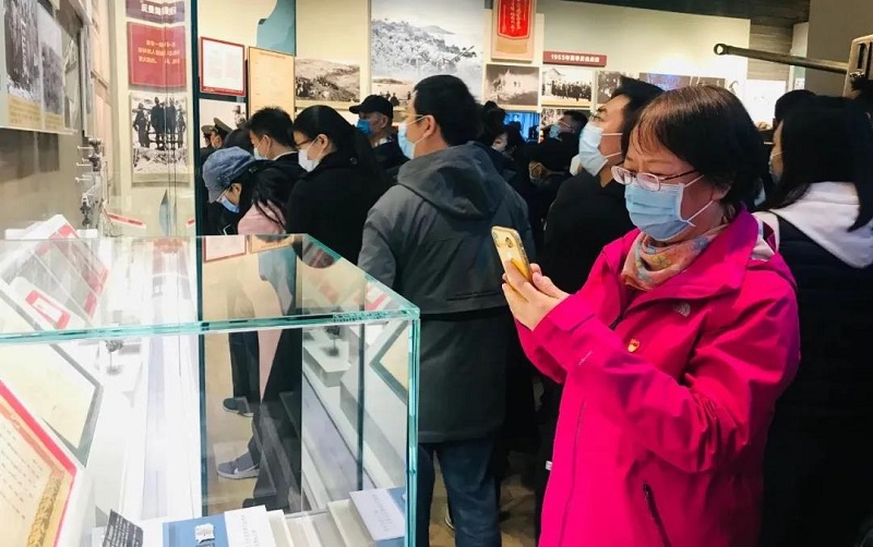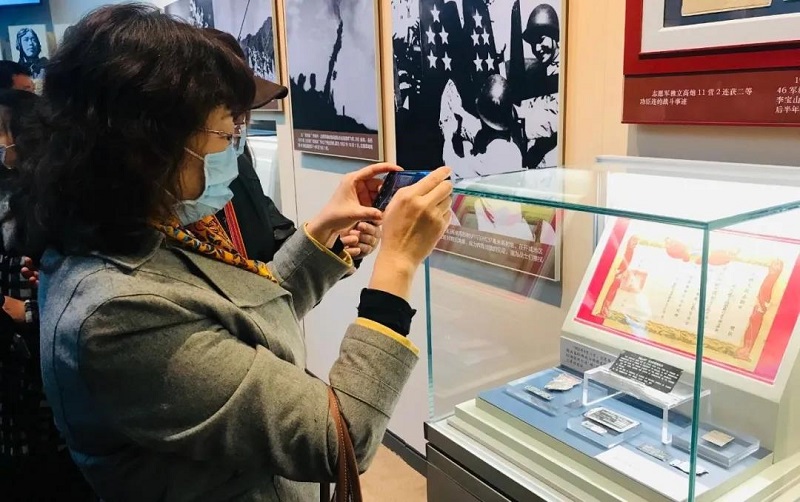 在讲解员的带领下,大家不时驻足仔细观看、向讲解员询问相关问题,用手机记录下这些动人心扉的照片、文献或场景。党员韩瑞丽的父亲也是抗美援朝志愿军的一员,曾出任炮兵连连长,获得三等功,观看展览的过程中,韩瑞丽难掩内心的激动,“这是我们父辈用热血与生命换来的伟大胜利。作为英雄的子女,我们都应该秉承父辈精神,以身作则,担起新时代赋予我们的新使命!”