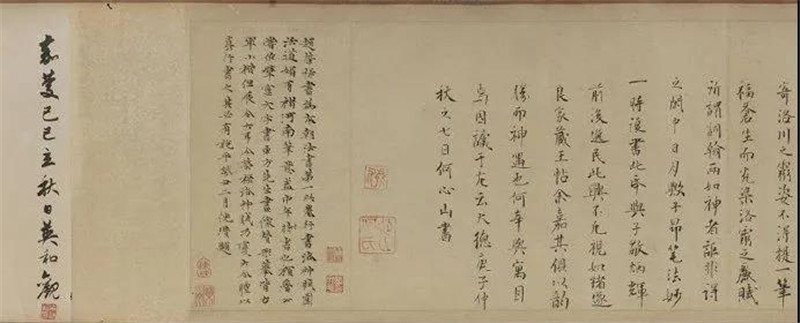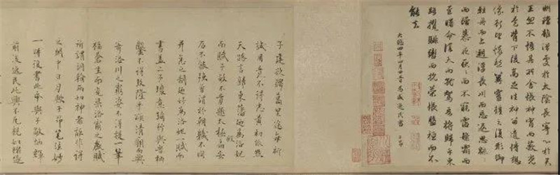 此书作于元大德四年(1300),是赵孟頫47岁时的作品。此作结构谨严,行中兼楷,运笔圆转流美,是赵孟頫行书代表作。全卷研美洒脱,结构端正匀称,布局密中有疏,运锋飘逸中见内敛,气势端美中具俯仰起伏,深得“二王”遗意的同时,也显示出赵孟頫博取众长而自成一体的艺术特色。卷尾有元代何心山、倪瓒题记,清代英和观款;曾经明代项元汴,清代陈淮,陈崇本,孙尔雅,崇恩及近代张翼等人鉴藏。