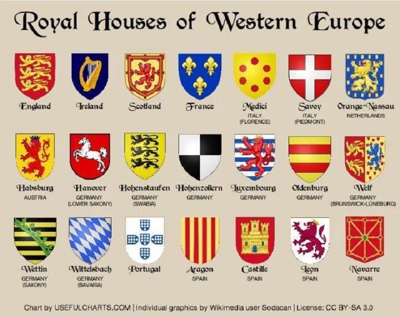 第三行为德国的韦廷家族、德国的维特尔斯巴赫家族、葡萄牙王国、阿拉贡王国、卡斯蒂利亚王国、莱昂王国、纳瓦拉王国。
