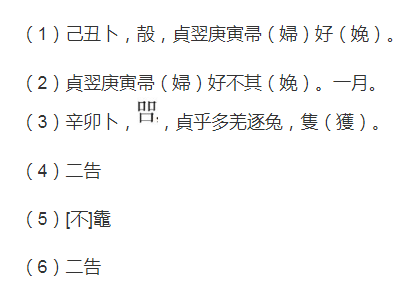 在卜辞中有相当一部分所问之事,是要经过一段时间以后才能得到验证。此时,还需要把所验证的结果再补充刻写于原有的记录之下,是为验辞。当验辞刻写完毕,占卜的全过程才能够宣告完成,卜辞的完整形式也随之出现。所以一条完整的卜辞主要包括叙辞、命辞、占辞和验辞四个部分。