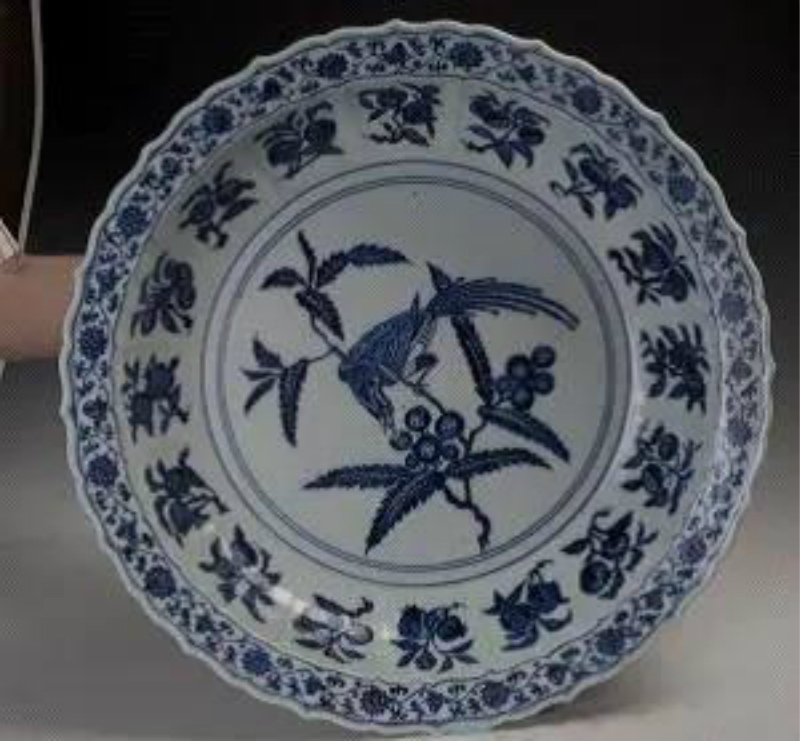 明代青花枇杷绶带鸟图盘是天津博物馆馆藏的重要藏品,同类纹样的永乐青花盘传世极少,天博馆藏的这件堪称珍品。就目前已经掌握的资料看,仅北京故宫博物院收藏一件,日本大阪市立东洋陶瓷美术馆收藏一件,天津博物馆收藏一件。
