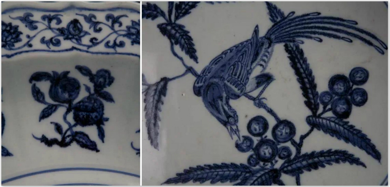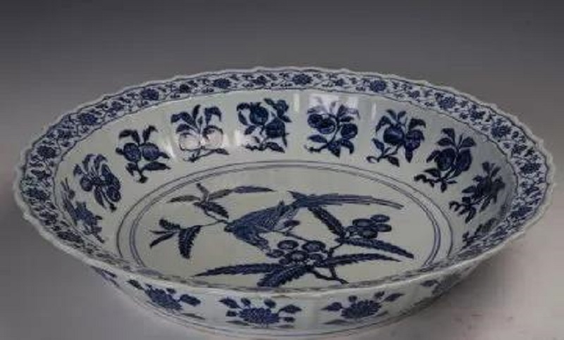天博藏明永乐青花枇杷绶带鸟纹盘,高9.7厘米,口径50.5厘米,底径34.8厘米。菱花口,板沿,细白砂底。通体施白釉,满绘青花纹饰。口沿内绘一周青花缠枝莲纹,外口沿为一周汹涌澎湃的青花海水纹。内壁十六个花瓣内绘形状不同的青花折枝花果,外壁十六个花瓣内绘青花折枝菊纹,内底双弦纹内主题纹饰为青花绘枇杷绶带鸟图。整个画面布局疏朗明快,运笔顿挫有致,极富节奏感,纹样显然出自同时期宫廷画院画师的稿本。此盘胎质细腻洁白,釉层肥厚晶亮,外底无釉,抚之有糯米粉般的爽滑感,青花色泽浓艳,蓝中泛黑,是用进口的“苏麻离青”料所绘。这种钴料在明朝时十分名贵。因为其含铁量高,含锰量低,所以,烧造后自然形成沉入胎骨的铁锈斑。