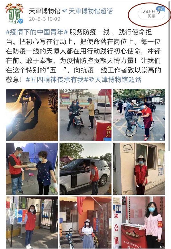 博物馆不仅肩负着宣传中华优秀传统文化的使命,同时也承担“为明天收藏今天”“弘扬时代正能量、守护人类精神家园、增强民族凝聚力”的神圣使命。2020年,我们在宣传弘扬优秀传统文化的同时,将目光更多的转向了当下。通过网络媒体平台,结合时事热点与具体展览,深入展示“抗疫精神”、“抗美援朝”精神、“女排精神”等,获得许多好评。同时,天津博物馆官方微博也更加注重讲述天博人的故事,下沉、献血、勇救落水者...天博正能量圈粉无数。5/4发布的“疫情下的青年”更是获得单条2435万的年度最佳阅读量。