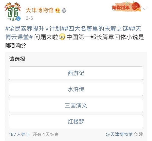 2020年,天津博物馆官方微博坚持每日更新,共推送博文4500多篇,阅读量超3亿,关注人数58万余人。