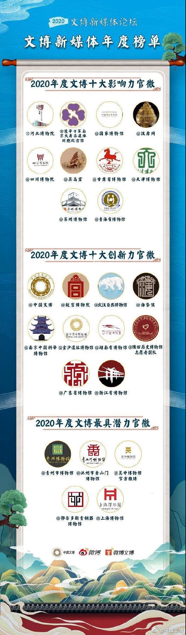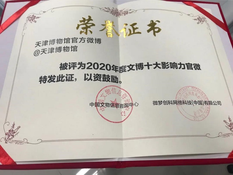 近期,由中国文物信息咨询中心和新浪微博共同主办的“文博新媒体论坛”,正式发布了2020年“文博新媒体年度榜单”,天津博物馆官方微博荣获2020年度文博十大影响力官微。这是继2019年后,天津博物馆官方微博(@天津博物馆)再次获此殊荣。