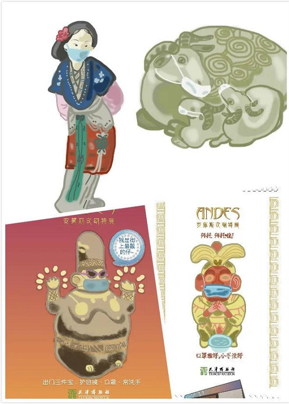 闭馆期间,天津博物馆官方微博不间断地发布与疫情相关的工作动态,活用馆藏文物宣传疫情防护,其中“花式教防疫”特辑通过生动的表情包形式宣传防疫知识,得到了观众朋友的喜爱,大家纷纷留言表示“既能了解异域文化,也能第一时间了解科学的防疫知识”。天津博物馆还积极参与文博联动,选取能反映抗疫精神的文物制作“文物系荆楚祝福颂祖国”文物传递祝福接力活动海报,为抗击疫情鼓舞士气,作出了文博贡献。