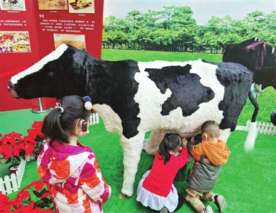孩子们在自然博物馆《牛气冲天》生肖特展展厅内“挤牛奶”。