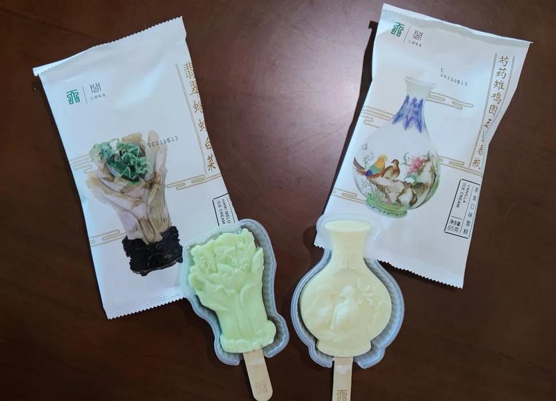 2021年5月18日,第四十五个世界博物馆日。天津博物馆首次推出两款文创雪糕,“乾隆款珐琅彩芍药雉鸡图玉壶春瓶雪糕”和“翡翠蝈蝈白菜雪糕” “糕”调亮相。