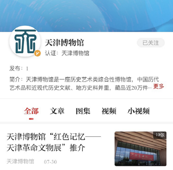 在光明号主页顶部搜索 “天津博物馆”。进入“天津博物馆”光明号,并点击关注