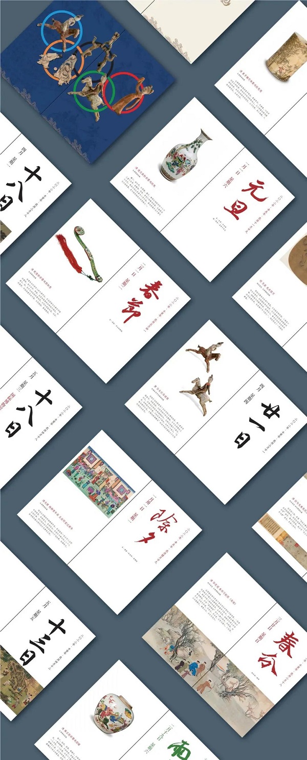 文物甄选上除反映馆藏特色的绘画、画像石、玉器、瓷器外,也有杨柳青年画、风筝、泥塑等贴近百姓生活的民间艺术作品。中国传统节日和二十四节气,采用碑拓集字,每处细节都有典可依。