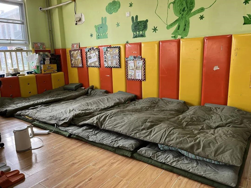 由于转天还需要为小区居民进行核酸筛查,凌晨1点左右,接到休息通知,我们便暂住在旁边的幼儿园教室,十几位女同志一起铺地铺。虽然条件简陋,但夜已深,身心疲惫,凌晨2点左右大家进入了梦乡。