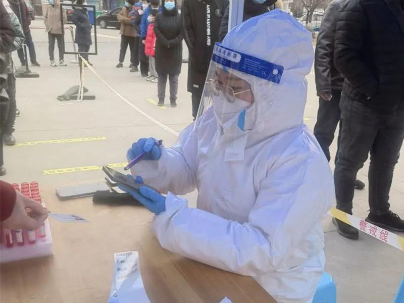 今天早上5点半,我们就去社区报道,参与双港镇仁和园社区顺和园小区5000多居民的核酸采集工作。虽然工作并不复杂,但在大寒之日不断询问、登记、疏通队伍,一站就是好几个小时,大家嗓子哑了,手冻麻了。闷热的防护服,起雾的眼睛,防护面罩下的水也不停往下流,流进口中都没空停歇……