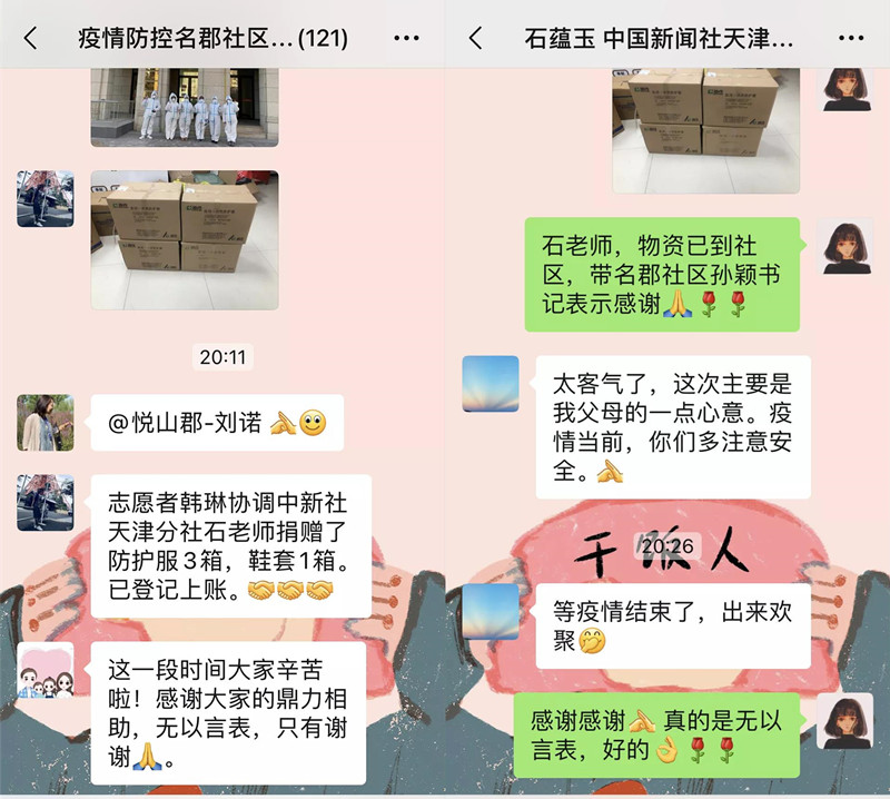 在结束执勤后,看到志愿者群里发布急需物资的消息,我也转发到了自己的朋友圈,很快朋友们都出谋划策,特别是中国新闻社天津分社的石蕴玉老师,为我们解了燃眉之急。后来,我才知道,天津地区物资紧缺,是石老师的父母从山东购买了3箱防护服和1箱鞋套,捐赠给我们。抵达的那天,社区所存防护服仅剩十余套,感谢之情无以言表。