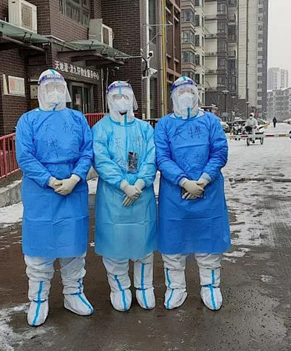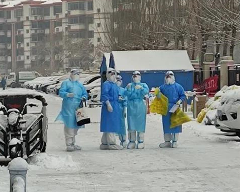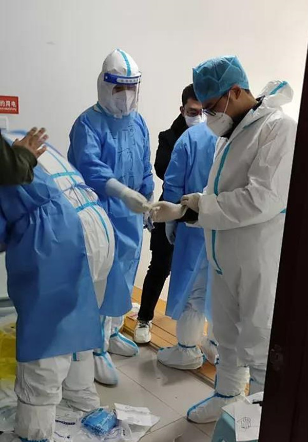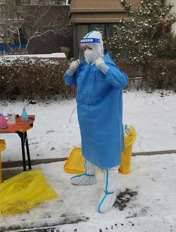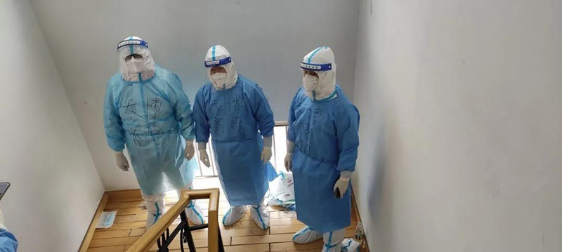 8号楼是津九轩范围内唯一的封控区。上午,同志们最重要的任务为协助医护人员采集8号楼的鼻拭子、咽拭子。8号楼之前曾出过确诊病例,风险较大。今天也是我们这些天来首次进入曾出过确诊病例的楼栋,大家都尤其小心,穿戴防护服等防护用具时,都格外注意规范、严密。好在有前几天工作的磨炼,我们已经积累了丰富的经验,最终顺利完成了任务。