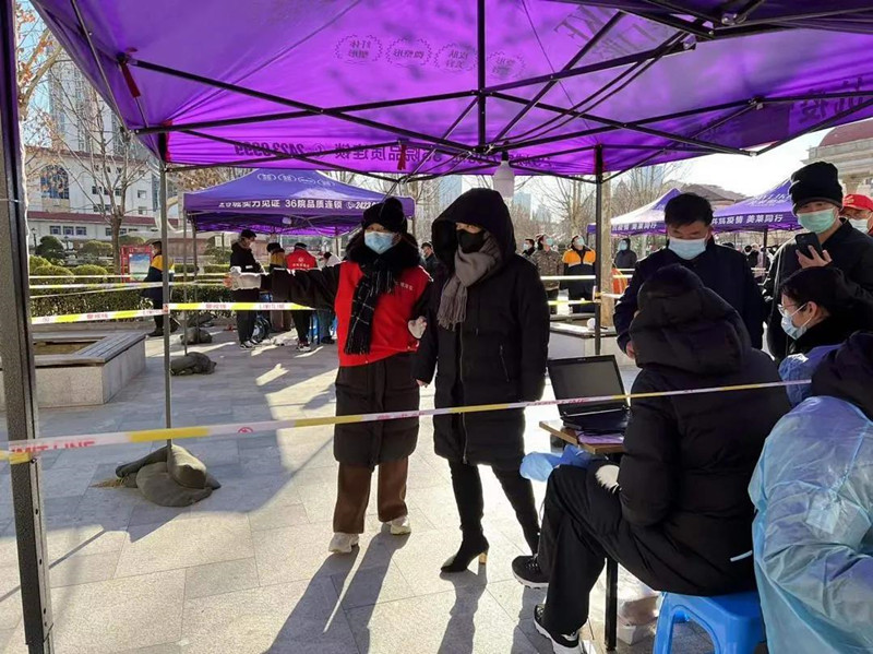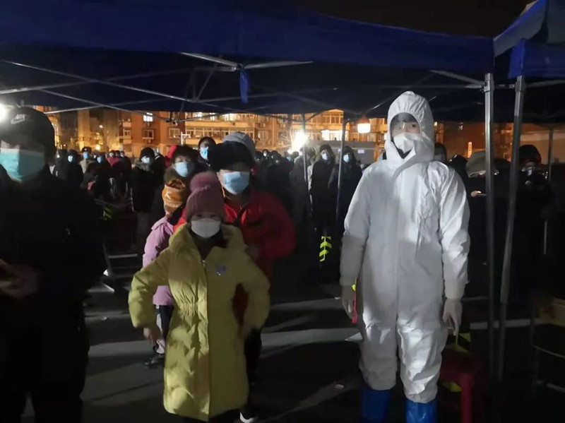三九天的凌晨,气温是彻骨的,而且几乎每次大筛都赶上降温,大家都里三层外三层地把自己裹成粽子。早上六点开始检测,准备工作就需要更加提前,所以每次参与大筛工作半夜就得起床,5点前就要到达支援现场安排布置。搭帐篷、布排卡、穿防护服,吃饭喝水也都顾不上,辛苦是理所当然。但只要精神不滑坡,办法就比困难多!在现场工作人员共同面对困难的激励下,在老百姓一句句“谢谢,你们辛苦了!”的感谢声中,刘芳菲和大家一起迎难而上,克服各种困难,换来一个个点位大筛工作的圆满完成。
