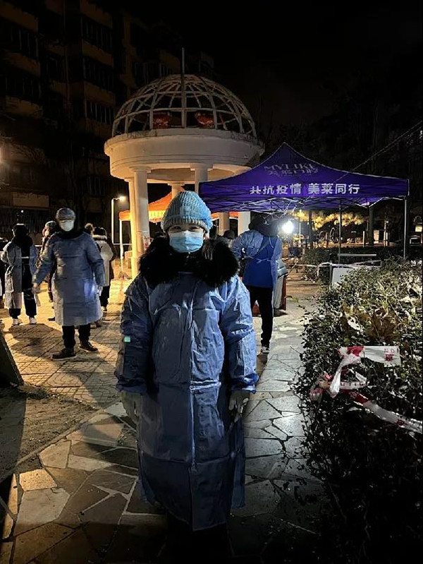 在全市第三次和第四次的“大筛”中,她和许许多多的志愿者一样,在城市还在熟睡的时候已经到达了值守点位,又在寒风中坚守岗位直至检测结束。她引导过“橙码”人员,也配合过检测医生进行采样,在遇到老人孩子有情绪需要疏导时,她又耐心地解释、安抚,尽自己能力引导每一个人做好检测。她在国家大义面前无私,面对风险而无畏,压力傍身而无怨。问到她在做志愿者期间,有什么特别想分享的经历时,她说:“没有什么,都是应该做的。”