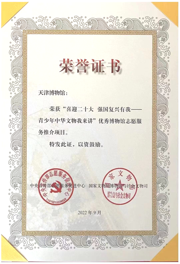 9月1日,中宣部志愿服务促进中心和国家文物局博物馆与社会文物司主办的“喜迎二十大 强国复兴有我——青少年中华文物我来讲”博物馆志愿服务项目推介活动在郑州召开。天津博物馆成功入围博物馆志愿服务推介项目!