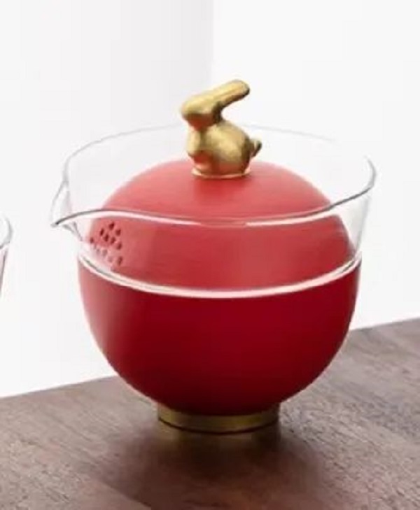 玉兔随手泡茶杯,杯盖以金兔为钮,拿握舒适方便,寓意吉祥美满。杯身以中国红配色,与金兔搭配相得益彰,喜庆不失典雅。