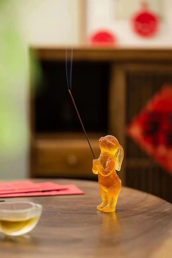 琉璃兔子香插采用古法琉璃制造技艺,讲究火里来、水里去,在1400度的高温中烧制而成。兔子造型身体微微前倾,前爪呈合十手势,神态祥和从容,寓意日出有盼,日落有念,平安顺遂,所遇皆安的积极向上的态度。在前爪合十的中间位置设有孔位,可作插香用。