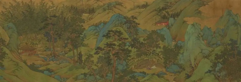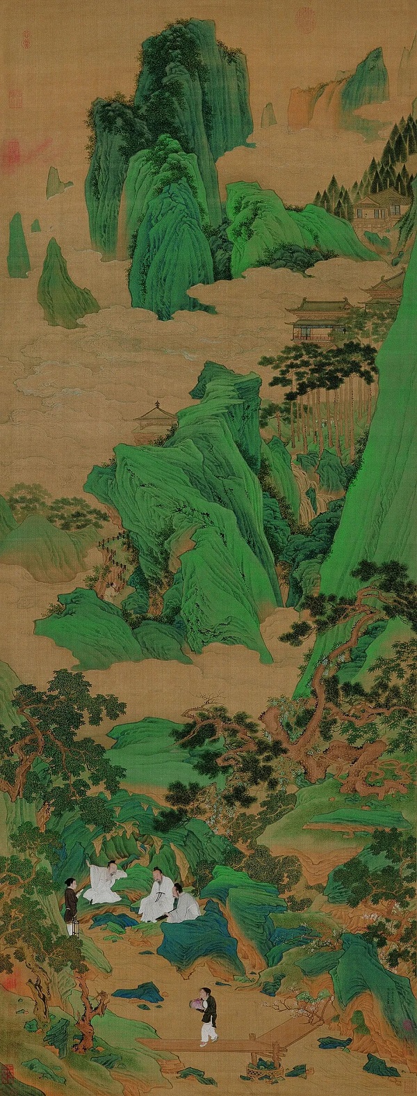 仇英(约1494-1552),字实父,号十洲,原籍江苏太仓,后移居苏州。出身微寒,以画为业,是吴门职业画家。仇英天资聪颖,拜周臣为师,并经由文徵明引介,与吴中文人士大夫以及周凤来(1523-1555)、陈官(卒于1557年之后)、项元汴(1525-1590)等收藏家往来密切,尤其是曾受项元汴延请至其家作画,得以广泛研习、临摹江南藏家收藏的宋元画作,融会古法,成就新意,形成自己独特的艺术风貌。画风不仅工谨细微,同时因受文徵明、唐寅等吴中文人的影响而具有细腻雅致的气韵,受到苏州文人的推崇。仇英山水脱胎于周臣,融合李唐等南宋院体传统,形成笔力清劲,刻画严谨,细润明丽的艺术风格。尤其是青绿山水,风骨劲峭,明艳鲜丽,被董其昌誉为“赵伯驹后身”。