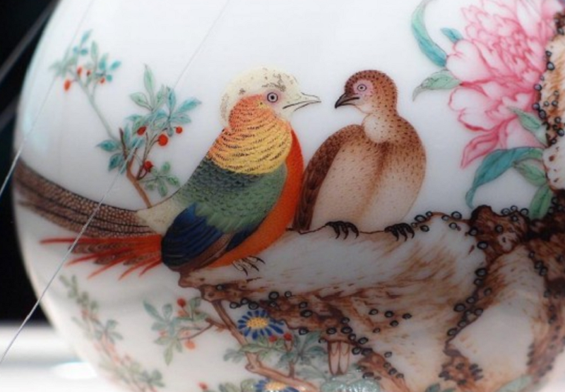 空白处墨彩题诗:“青扶承露蕊,红妥出阑枝。”引首朱文“春和”印,句尾白文“翠铺”朱文“霞映”二方印。瓶底赭彩四字方款“乾隆年制”。芍药雉鸡寓意金鸡富贵,有吉祥的含义。画工精细入微,绘画图案取自清代宫廷画家的手稿。此瓶集诗、书、画、印于一身,有如一幅展开的画卷。
