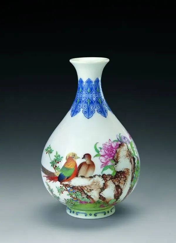 天津博物馆所藏清乾隆款珐琅彩芍药雉鸡图玉壶春瓶,是国宝级文物,是天津博物馆的三件镇馆之宝之一。小撇口,长颈,腹部下端丰满,圈足。瓶胎质细腻洁白,胎体轻薄,釉面莹润如玉,上用珐琅彩绘画。颈部用蓝料彩绘上下两组蕉叶纹,腹部珐琅彩绘芍药雉鸡图:两只雌雄雉鸡栖身于山石上,彼此相偎,作态亲昵,周围衬以芍药花及秋季花草。