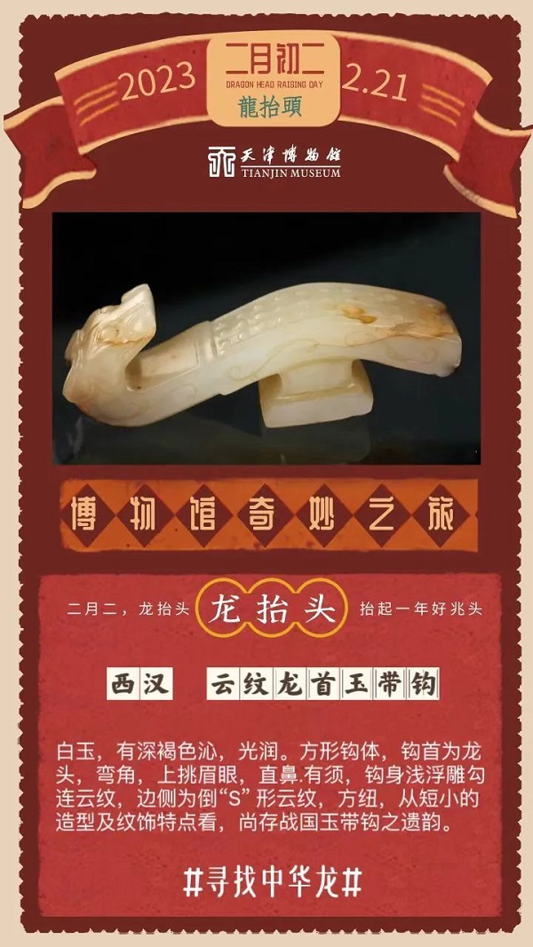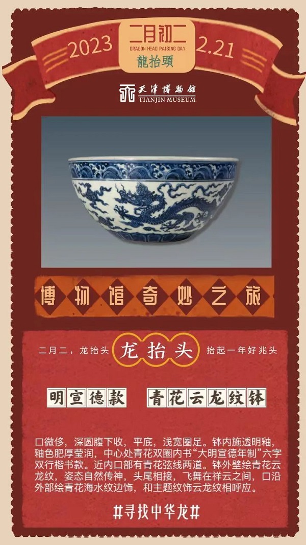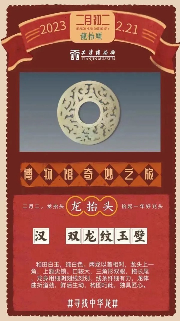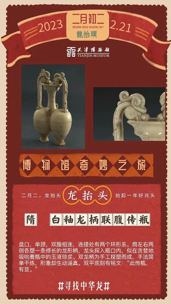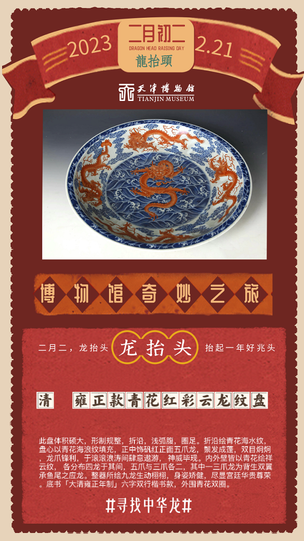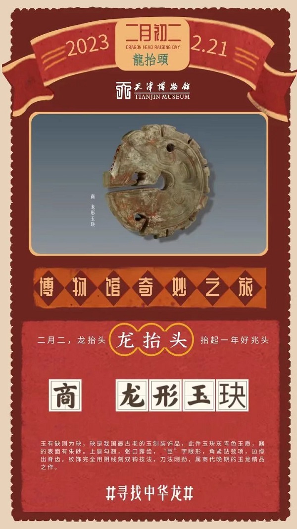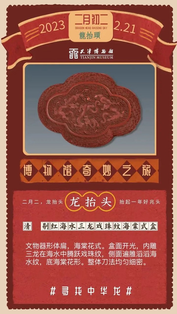 2023年2月21日,央视新闻客户端总台天津总站发表文章《二月二龙抬头!来天津博物馆寻找文物里的中国龙》,总台国际在线利用天津博物馆龙文物元素制作主题海报。龙,作为中华民族的图腾流传至今。在数千年的中华文化中,“龙”无处不在。它们或飞舞在瓷器中,或腾跃在图画里,或盘旋在玉器上。二月二龙抬头,来天津博物馆一起寻找文物中的中华龙,抬起一年好兆头!