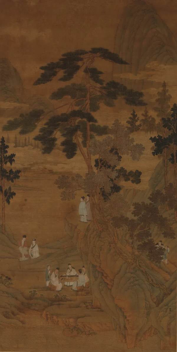 周臣是吴门职业画家,技法纯熟,但因受吴地文人圈的影响,作品中别有文雅一体,此图就是其中的重要代表。图绘远峰缥缈,白云翳其山脚。长松挺拔,水面微波粼粼。九老中,松荫下二老远眺,山间小径二老畅谈、一长者携童缓缓走来。临水平坡置一长方桌,一老者弹琴,三老者围坐听琴。